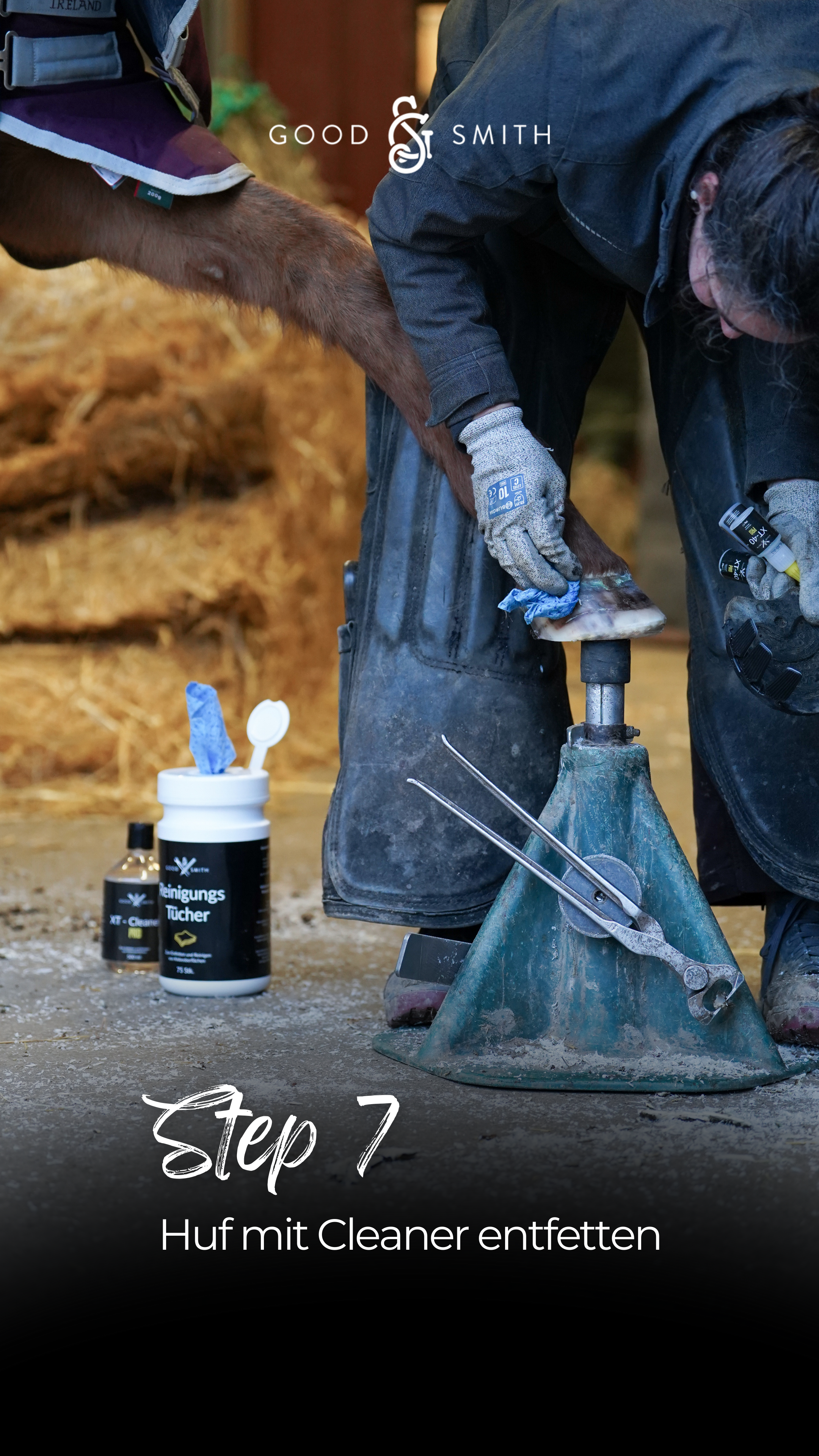 Unser Goodsmith Cleaner XT dient zur Vorbereitung bei der Verarbeitung unserer Perma XT Produkte. Im Anschluss an die reguläre Hufbearbeitung und vor dem Verkleben der Klebelaschen wird der Huf sowie die Laschenfinger mit unserem XT-Cleaner gereinigt und entfettet.
